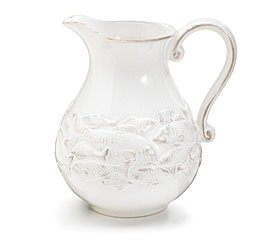 Handwash only/FDA approved.White pitcher with slightly raised school of fish wrapping around the center section. Made of ceramic.7 1/4"H X 2 1/2"Opening X 45 oz